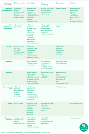 Aanspreekpunt – Actief begrijpen – Alle acties tellen – Alles in beeld – Alternatieve manieren – Altijd een antwoord – Beleidsplan en zelfevaluatie – Bespreekbaar maken – Bewust maken – Blijvend in gesprek – Blijven leren (opleiding) – Buiten de lijntjes durven denken – Brede blik – Controleerbare doelen – De juiste mensen betrekken – Denken aan de toekomst – Doen wat je zegt – Durven twijfelen, durven proberen – Duurzaam maken – Een lerende organisatie zijn – Eenvoud – Een zichtbaar resultaat – Eigen stem versterken – Elkaar begrijpen – Elkaar optillen – Energie gericht inzetten – Flexibele vraag – Gebruik wat werkt – Gedeelde waarden – Geen gesloten club – Gelijkwaardig – Gericht op oplossingen – Hedendaags – Helpen groeien – Herhalen helpt – Herkenbaar en zichtbaar – Het geeft goesting – Iedereen heeft een plaats – Iedereen krijgt een stem – Iedereen moet kunnen meedoen – Inclusief ontwerpen – Inspirerend werken – Juiste toon – Kennis bewaren en delen – Kosten en baten delen – Kracht delen (empowerment) – Kritisch en reflectief – Kruispuntdenken – Kwaliteit controleren – Locatie, tijd en vorm – Lusten en lasten – Neutrale informatie – Ondernemen voor de samenleving – Oog voor gevolgen – Ook korte trajecten – Open en doorzichtig – Open toegang – Op maat – Opvolgen van kwaliteit – Regelmatig evalueren – Rekening houden met diversiteit – Resultaten delen – Ruimte voor proefprojecten – Samen dragen, samen beslissen – Samen gedragen – Samenhang – Samen maken (co-creatie) – Samen voor iedereen – Slim vooruitdenken – Stapsgewijs – Stem van onderuit (bottom-up) – Tijd om te leren – Timing en verwachtingen – Uitvoering dicht bij de zorgvrager – Van ik naar wij – Verantwoordelijkheid – Verbinding als basis – Verbonden speelveld – Verdraagzaam – Verhalen vertellen – Vertrouwen – Visie als vertrekpunt – Vooruit durven denken – Vooruitdenken en voorspelbaar – Vorm versterkt inhoud – Vrijheid creëren – Vrijwilligers betrekken – Waarde toevoegen – Werken met ambitie – Weten wat werkt – Zichtbaar maken – Zonder polarisatie