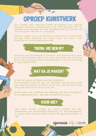 FOVIG is op zoek naar kunstwerken van vooral mensen met een (vermoeden van) verstandelijke beperking. Zij kunnen rond het thema Wie ben ik (identiteit) kunstwerken insturen. Spinaas drukt die nadien op kleding: T-shirts, sjaals, keukenschortjes, petjes …